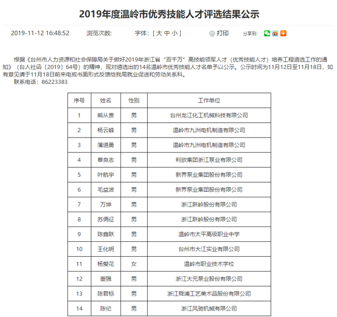 為高水平建設人才強省,進一步加快高技能人才隊伍建設,我司根據《臺州市人力資源和社會保障局關于做好2019年浙江省“百千萬”高技能領軍人才培養工程遴選工作的通知》要求,通過我司推薦,經資格初審、評委會評審等環節,我司研發中心陳紀被評選為溫嶺市優秀技能人才,并在網上予以公示,符合公司的價值觀 “客戶為先、誠信負責、團隊合作、務實創新”精神。