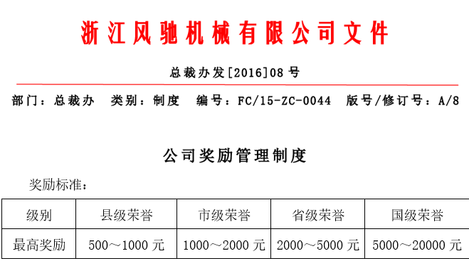 我司研發(fā)中心李軍輝在評(píng)選中符合評(píng)選要求,表現(xiàn)突出,突出重圍,成功入選被評(píng)為“杰出臺(tái)州工匠”,根據(jù)公司獎(jiǎng)勵(lì)制度中的“特別榮譽(yù)獎(jiǎng)勵(lì)獲得市級(jí)榮譽(yù)獎(jiǎng)勵(lì)1000~2000元”的標(biāo)準(zhǔn),公司給予李軍輝獎(jiǎng)勵(lì)現(xiàn)金2000元,并發(fā)布于公司平臺(tái)表彰通告,以示祝賀。