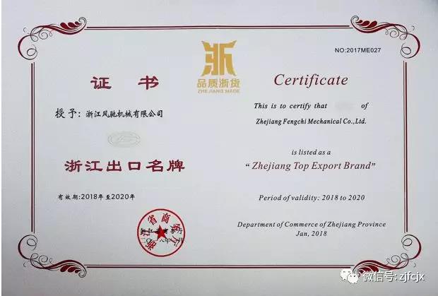 2018年1月榮獲浙江省商務廳頒發的“浙江出口名牌”